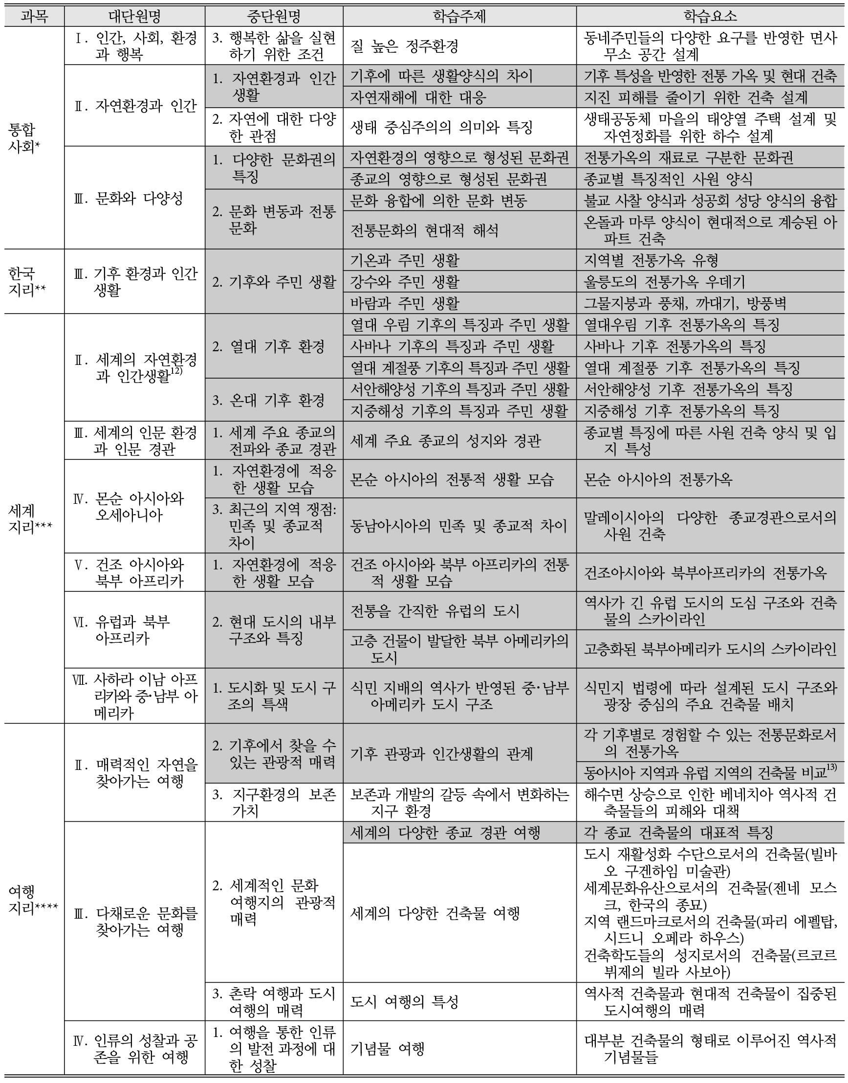 - This study explores the integration of architecture into geography education in response to rising public interest, the expanding institutional role of architecture in public life, and recent curricular reforms in Korea. A review of the curriculum shows that traditional architecture-related themes -especially vernacular houses— remain constrained by environmental determinism and residual culture-oriented. Recent revisions, however, have introduced themes of sustainable practices and the creation of high-quality residential environments, reflecting a paradigm shift toward practical competencies for desirable place-making. To advance this shift, the study proposes three thematic directions: modernizing traditional themes with sustainability education, examining changes in architecture and everyday life through technological development, and fostering active citizenship through learning the basic concepts of architectural design.