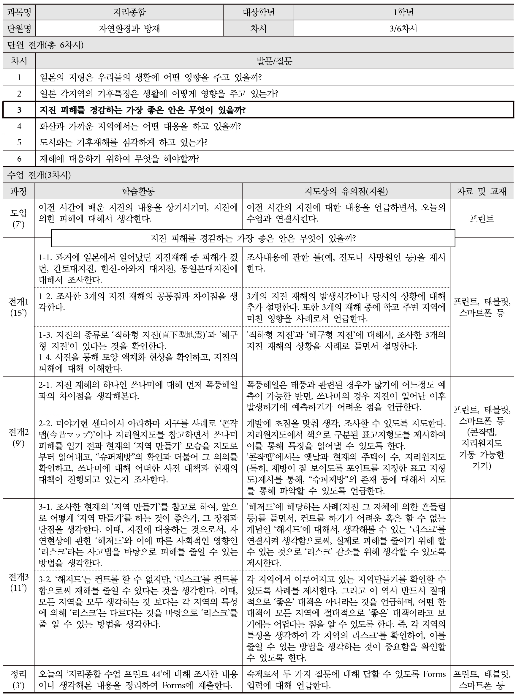 수업을 통해 본 일본 고교 필수과목 「지리종합」에서의 방재교육 사례연구: 대단원 ‘지속가능한 지역 만들기와 우리들’을 중심으로