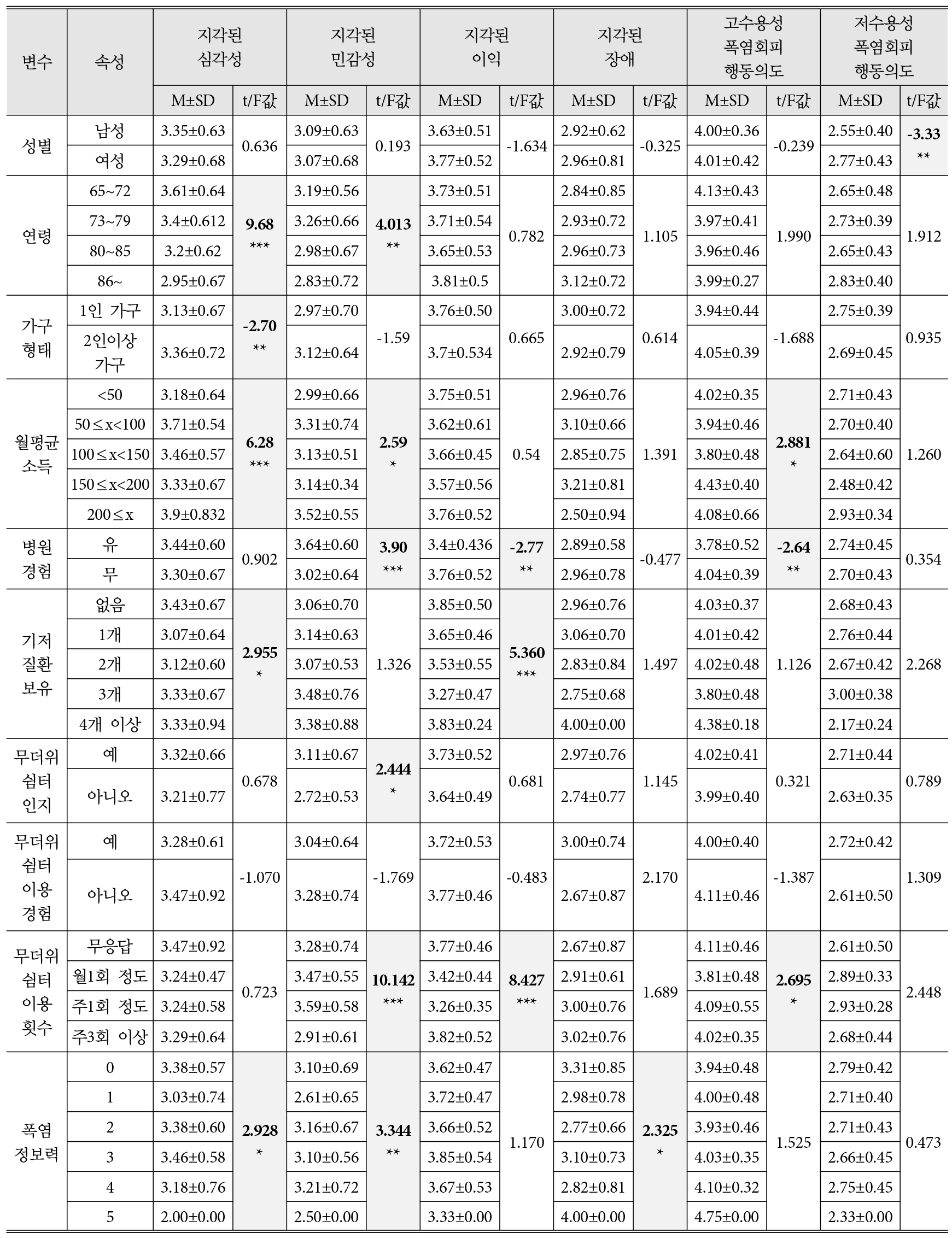 - Individual risk-taking behaviors play a key role in reducing heatwave-related health damage. This study applied the Health Belief Model (perceived severity, susceptibility, benefits, and barriers) to examine general characteristics and health belief factors influencing heatwave avoidance intentions among the rural elderly in Korea. Avoidance intentions were categorized into high- and low-acceptability behaviors. Data were collected via a survey of 194 individuals aged 65 or older in rural areas of Dangjin-si, Chungcheongnam-do. Analyses included descriptive statistics, t-tests, ANOVA, Pearson correlation, and hierarchical regression. Results showed significant differences in health beliefs and avoidance intentions by age, household type, income, hospital visits, chronic diseases, and use of heat shelters. Perceived benefits were closely related to high-acceptability behaviors, while perceived severity and susceptibility were most relevant for low-acceptability behaviors. Regression analysis confirmed that perceived benefits primarily influenced high-acceptability intentions, whereas age and perceived severity shaped low-acceptability intentions. These findings are expected to enhance the understanding of the complexity of heatwave avoidance behaviors and contribute to the development of heatwave response policies, particularly in risk communication, by supporting the formation of social networks among the elderly and tailoring strategies according to the level of behavioral acceptability.
